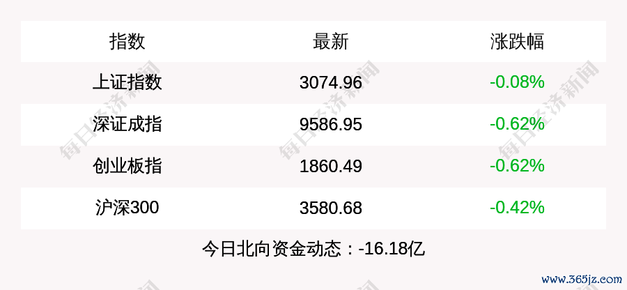 每经AI快讯:北京时间4月2日15:00,上证指数收盘下跌2.42点,跌幅为0.08%,报收3074.96点,成交额3967.06亿元;深证成指收盘下跌60.12点,跌幅为0.62%,报收9586.95点,成交额5709.47亿元;创业板指收盘下跌11.63点,跌幅为0.62%,报收1860.49点,成交额2442.3亿元;沪深300收盘下跌14.97点,跌幅为0.42%,报收3580.68点,成交额2202.08亿元。北上资金当日净流出16.18亿元。
