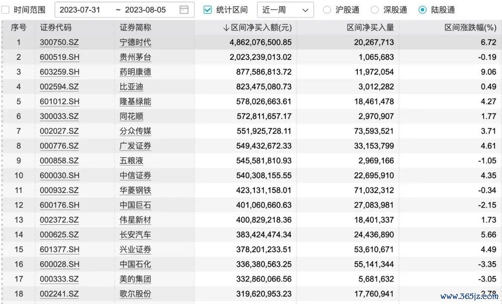个股方面,据Wind统计,本周,宁德时代(300750)、贵州茅台(600519)两大龙头股获北向资金大量加仓,净买入金额分别为48.62亿元、20.23亿元,此外,药明康德(603259)、比亚迪(002594)、隆基绿能、同花顺(300033)等获净买入超5亿元。