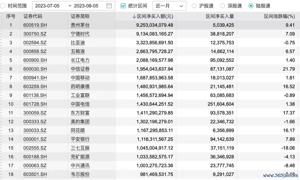 从近1个月来净买入数据看,贵州茅台(600519)、宁德时代两大龙头同样获北向资金大额净买入,金额均超90亿元。比亚迪获净买入金额超30亿元;五粮液(000858)、长江电力(600900)超20亿元;中信证券(600030)、中国移动、药明康德、工业富联(601138)等多股获净买入超10亿元。